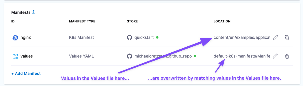 If you also add a separate Values YAML file in Manifests using the Values YAML type (described below), that Values YAML will overwrite any matching values in the Values YAML in the Manifest File/Folder Path.
