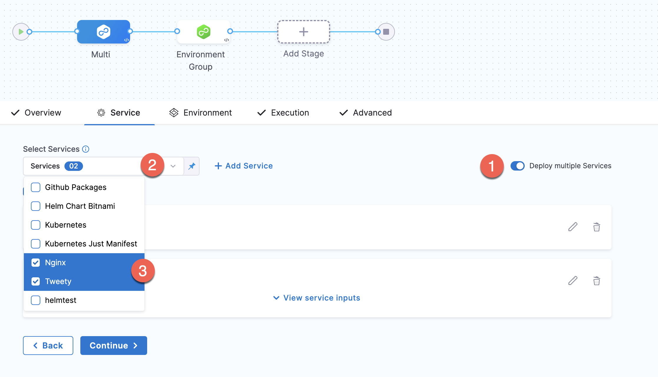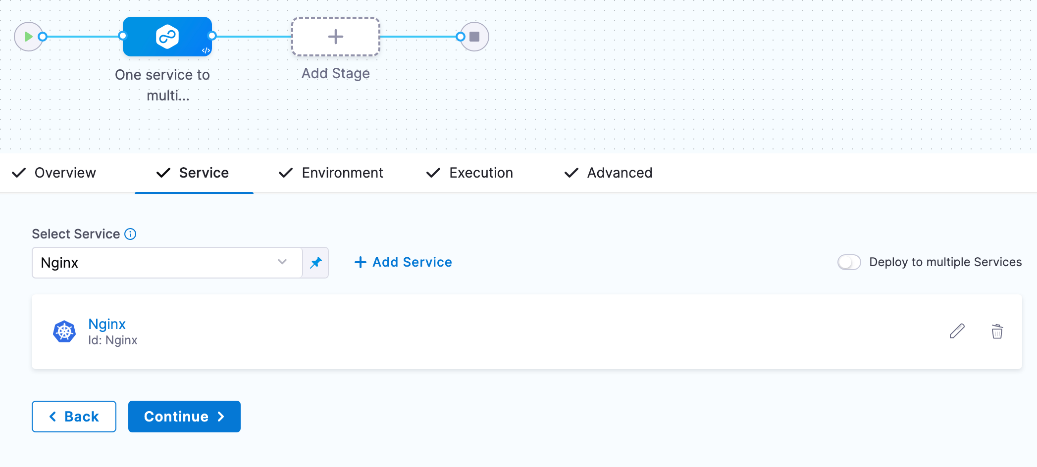 Often, you will deploy one service to one Environment in a CD stage. In some cases, you might want to use multiple services and environments in the same stage.