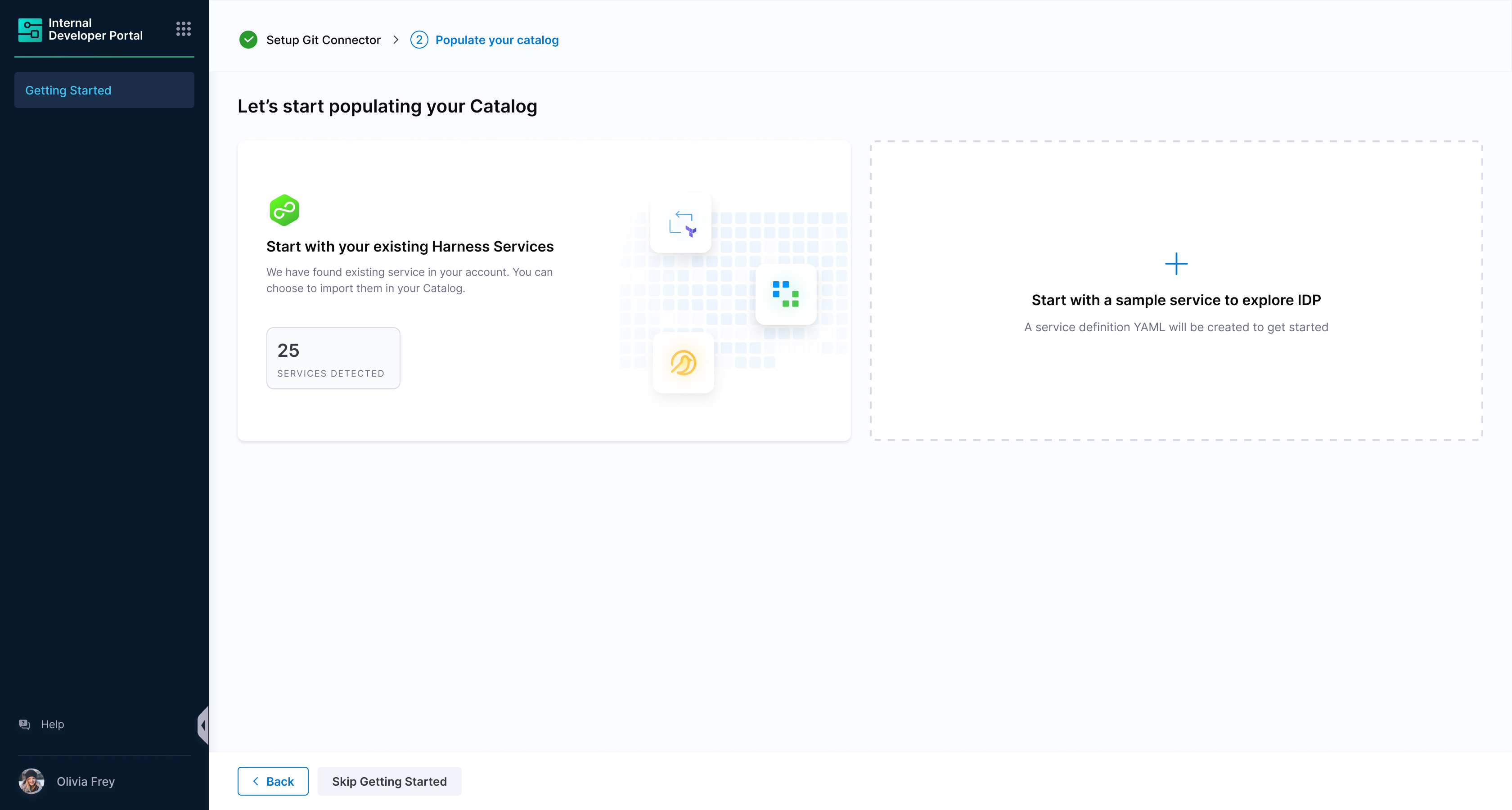 Users will now have option to onboard existing Harness services into IDP, or start with a sample service.