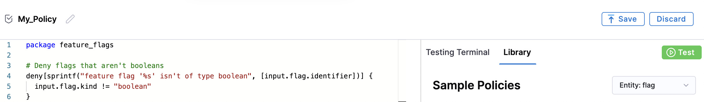 Select a pre-existing flag policy from the list. The Rego code will populate in the Library editor.