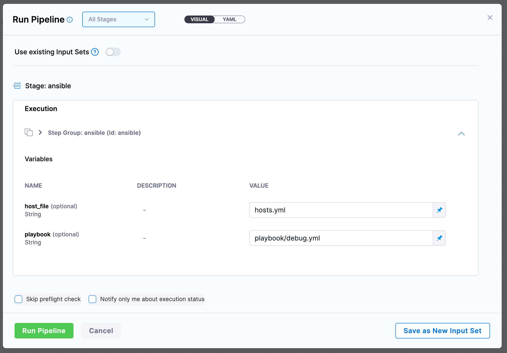 ansible-playbook --private-key=id_rsa -i <+execution.steps.ansible.variables.host_file> -e '<+execution.steps.ansible.variables.extra_vars>' <+execution.steps.ansible.variables.playbook>