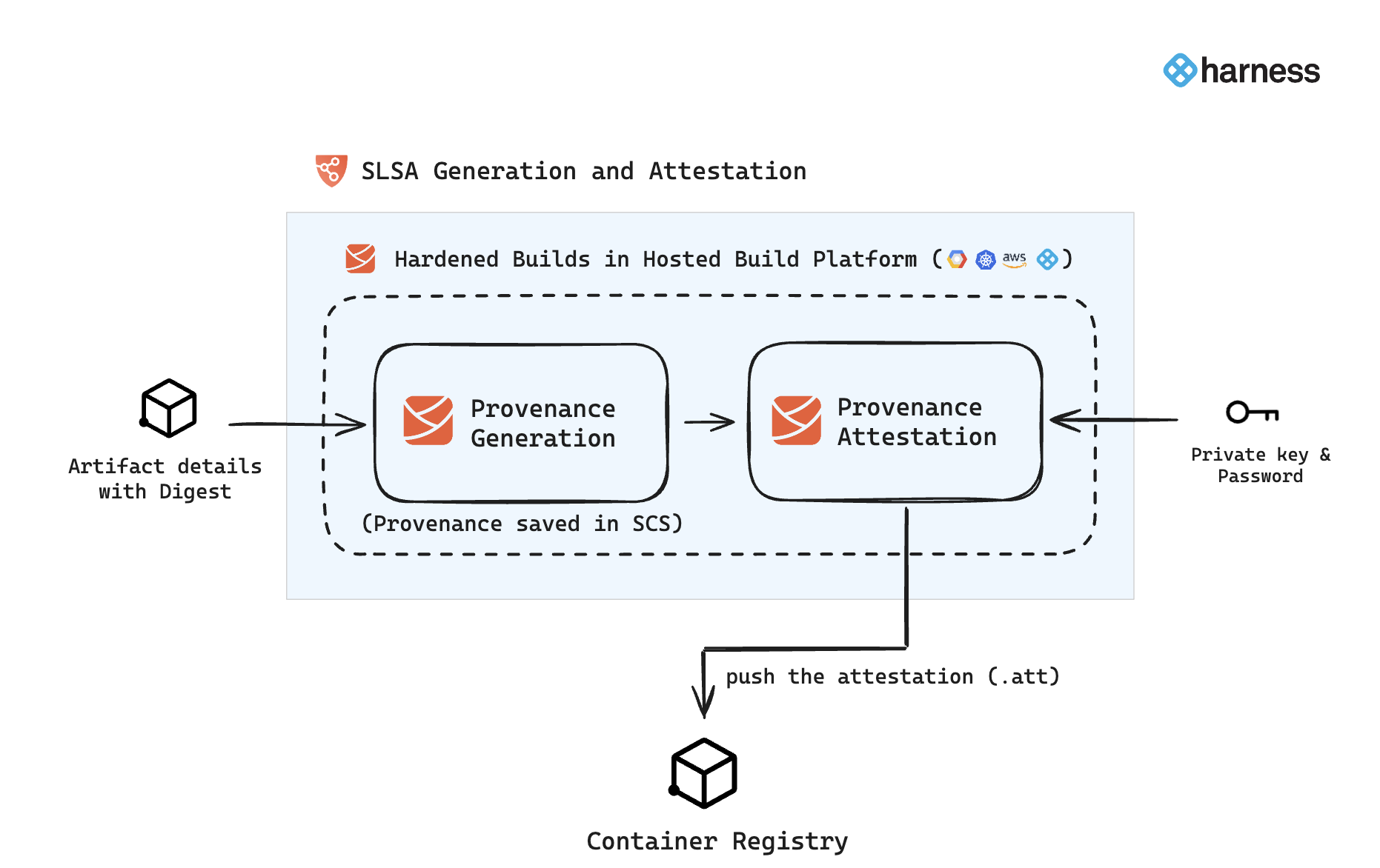 In Harness SCS, you can use the SLSA Generation step to configure your pipeline to generate SLSA Provenance and optionally attest and sign the attestation. The generated provenance is saved in Harness and can be easily accessed from the Artifact section in SCS. If the provenance is attested and signed with keys, the resulting attestation file (.att) is pushed to the container registry. Here's an overview of the workflow: